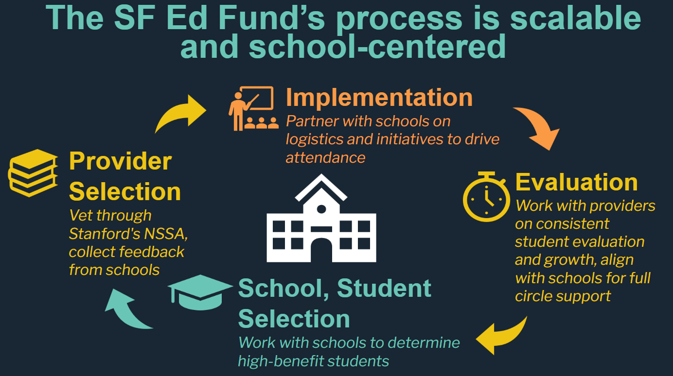 The SF Ed Fund works with Stanford’s National Student Support Accelerator and schools to vet providers, then with schools to qualify and select student participants, and finally with schools and providers on implementation and evaluation. This model is unique to the SF Ed Fund, and is school-centered to ensure a continuous cycle of feedback and improvements. The SF Ed Fund currently provides high-impact literacy tutoring in 22 Priority Schools.