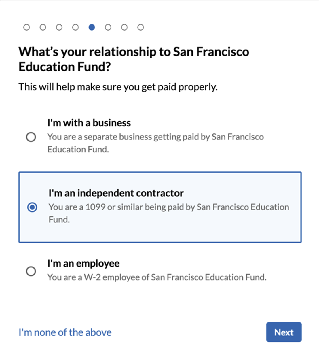 You'll be asked, "What is your relationship to San Francisco Education Fund?" Please select "I'm an independent contractor"