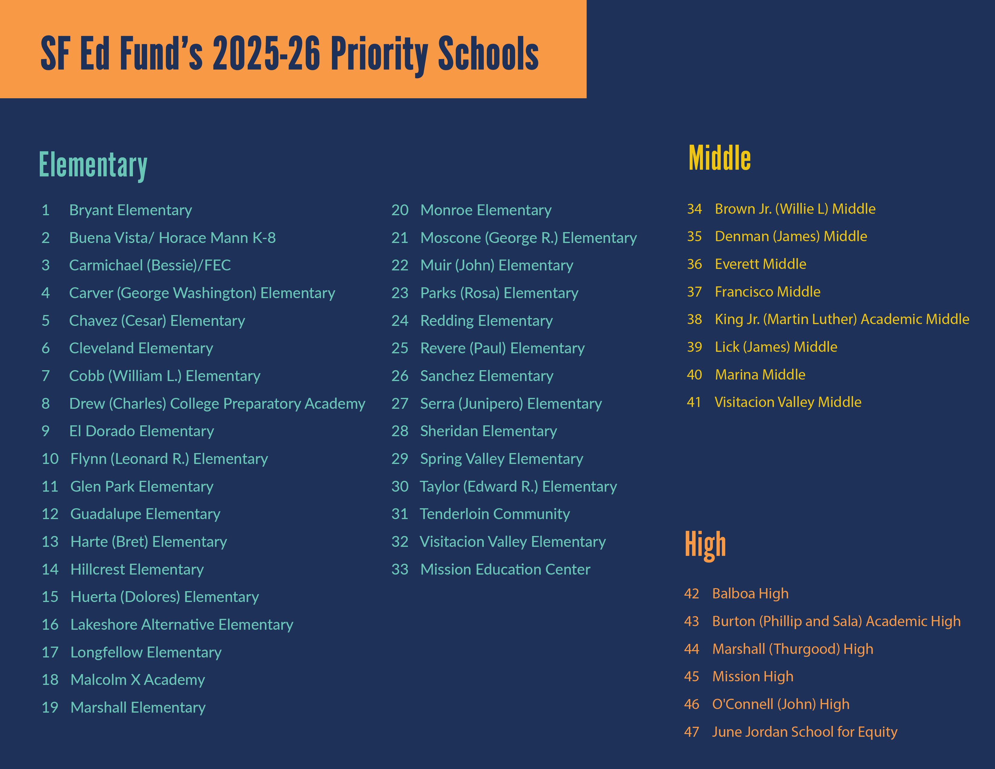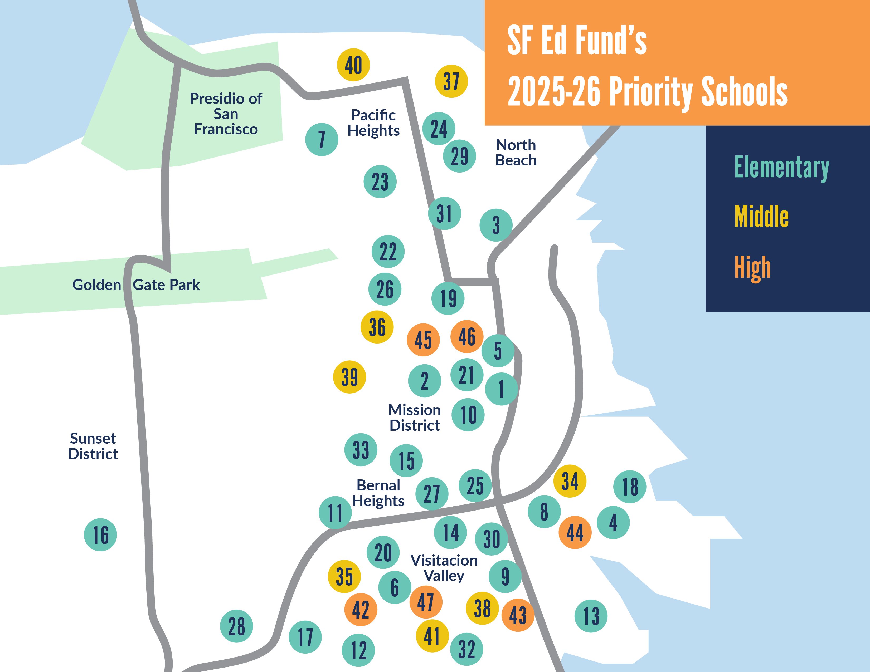 Programs serve PreK-12 public schools in San Francisco with an emphasis on high-benefit communities. These communities include low-income neighborhoods, undocumented and newcomer families, and English language learners. The SF Ed Fund primarily resources its Priority Schools, at which over half of students receive free/reduced lunch or are not yet proficient in literacy. SFUSD serves approximately 50,000 students, over half of whom are faced with financial challenges and limited access to academic or mental health support beyond the classroom.